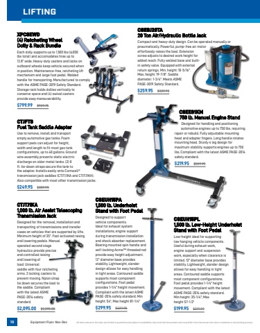 10 Equipment Flyer: Nov-Dec All items shown in this flyer are limited in quantities and subject to availability. Also note that the printed color may differ from the actual color due to variations in the printing process.LIFTING Air CompressorsCSEBJ20TA 20 Ton Air/Hydraulic Bottle JackCompact and heavy-duty design. Can be operated manually or pneumatically. Powerful, pump-free air motor effortlessly raises the load. Extension screw adjusts to desired work height for added reach. Fully welded base and builtin safety valve. Equipped with external return springs. Min. height: 10-5/16\Max. height: 19-7/8\diameter: 1-3/4\PASE-2019 Safety Standard. $259.95 $339.95CSEES1KM 750 lb. Manual Engine StandDesigned for handling and positioning automotive engines up to 750 lbs. requiring repair or rebuild. Fully adjustable mounting head and adapter fingers. Long handle rotates mounting head. Sturdy 4 leg design for maximum stability supports engines up to 750 lbs. Compliant with the latest ASME PASE-2014 safety standard. $219.95 $289.95CSEUH15PA 1,500 lb. Underhoist Stand with Foot PedalDesigned to support vehicle components. Ideal for exhaust system installations, engine support during transmission installation and shock absorber replacement. Bearing mounted spin handle and self-locking Acme%u2122 threaded rod provide easy height adjustment. 12%u201d diameter base provides stability. Lightweight, slender design allows for easy handling in tight areas. Contoured saddle supports most component configurations. Foot pedal provides 1-1/4\Compliant with the latest ASME PASE-2014 safety standard. Min height: 54\$299.95 $329.95CSEUH15PL 1,500 lb. Low-Height Underhoist Stand with Foot PedalLow-height ideal for supporting low hanging vehicle components. Useful during exhaust work, engine support and suspension work, especially when clearance is limited. 12%u201d diameter base provides stability. Lightweight, slender design allows for easy handling in tight areas. Contoured saddle supports most component configurations. Foot pedal provides 1-1/4\movement. Compliant with the latest ASME PASE-2014 safety standard. Min height: 35-1/4\height 57-1/2\$199.95 $219.99CTJFTS Fuel Tank Saddle AdapterUse to remove, install and transport empty automotive gas tanks. Foam support pads can adjust for height, width and length to fit most gas tank configurations, up to 40 gallons. Ground wire assembly prevents static electric discharge on older metal tanks. (2) 8 ft. tie-down straps secure the tank to the adapter. Installs easily onto Cornwell%u00ae transmission jack saddles (CTJTJ1KA and CTJTJ1KH). Also compatible with most other transmission jacks. $249.95 $309.95CTJTJ1KA 1,000 lb. Air Assist Telescoping Transmission JackDesigned for the removal, installation and transporting of transmissions and transfer cases on vehicles that are supported by lifts. Minimum height of 35%u201d. Foot activated raising and lowering pedals. Manual operated second stage hydraulics provide precise and controlled raising and lowering of load. Universal saddle with four ratcheting arms. 2 locking casters to prevent moving. Nylon strap tie down secures the load to the saddle. Compliant with the latest ASME PASE-2014 safety standard. $2,095.00 $2,395.00XPCSEWD (4) Ratcheting Wheel Dolly & Rack BundleEach dolly supports up to 1,500 lbs (6,000 lbs total) and accomodates tires up to 12.8\outboard wheels keep vehicle secured when in position. Maintenance-free, ratcheting lift mechanism and large foot pedal. Welded handle for transporting. Manufactured to comply with the ASME PASE-2019 Safety Standard. Storage rack holds dollies vertically to conserve space and (4) swivel casters provide easy maneuverability. $799.99 $939.75