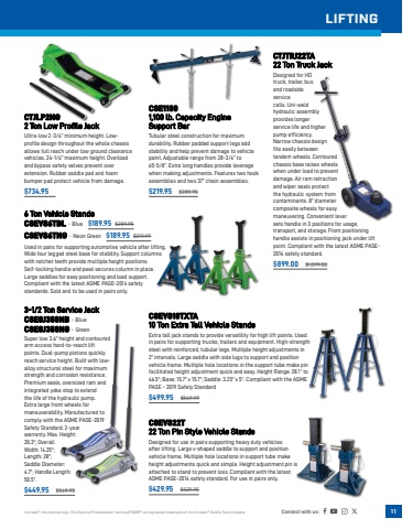Cornwell%u00ae, the Ironman Logo, The Choice of Professionals%u00ae and bluePOWER%u00ae are registered trademarks of the Cornwell%u00ae Quality Tools Company. Connect with us: 11CTJLP2NG 2 Ton Low Profile JackUltra-low 2-3/4%u201d minimum height. Lowprofile design throughout the whole chassis allows full reach under low ground clearance vehicles. 24-1/4%u201d maximum height. Overload and bypass safety valves prevent over extension. Rubber saddle pad and foam bumper pad protect vehicle from damage. $734.95 CSE1100 1,100 lb. Capacity Engine Support BarTubular steel construction for maximum durability. Rubber padded support legs add stability and help prevent damage to vehicle paint. Adjustable range from 28-3/4%u201d to 65-5/8%u201d. Extra long handles provide leverage when making adjustments. Features two hook assemblies and two 37%u201d chain assemblies.$219.95 $289.95CSEVS10TXTA 10 Ton Extra Tall Vehicle StandsExtra tall jack stands to provide versatility for high lift points. Used in pairs for supporting trucks, trailers and equipment. High-strength steel with reinforced, tubular legs. Multiple height adjustments in 2\vehicle frame. Multiple hole locations in the support tube make pin facilitated height adjustment quick and easy. Height Range: 28.1\46.5\PASE %u2013 2019 Safety Standard $499.95 $549.99CSEVS22T 22 Ton Pin Style Vehicle StandsDesigned for use in pairs supporting heavy duty vehicles after lifting. Large v-shaped saddle to support and position vehicle frame. Multiple hole locations in support tube make height adjustments quick and simple. Height adjustment pin is attached to stand to prevent loss. Compliant with the latest ASME PASE-2014 safety standard. For use in pairs only. $429.95 $529.956 Ton Vehicle StandsCSEVS6TBL - Blue $189.95 $209.95Used in pairs for supporting automotive vehicle after lifting. Wide four legged steel base for stability. Support columns with ratchet teeth provide multiple height positions. Self-locking handle and pawl secures column in place. Large saddles for easy positioning and load support. Compliant with the latest ASME PASE-2014 safety standards. Sold and to be used in pairs only. CSEVS6TNG - Neon Green $189.95 $219.99Air Compressors LIFTINGCTJTRJ22TA 22 Ton Truck JackDesigned for HD truck, trailer, bus and roadside service calls. Uni-weld hydraulic assembly provides longer service life and higher pump efficiency. Narrow chassis design fits easily between tandem wheels. Contoured chassis base raises wheels when under load to prevent damage. Air ram retraction and wiper seals protect the hydraulic system from contaminants. 8%u201d diameter composite wheels for easy maneuvering. Convenient lever sets handle in 3 positions for usage, transport, and storage. Front positioning handle assists in positioning jack under lift point. Compliant with the latest ASME PASE2014 safety standard. $899.00 $1,099.003-1/2 Ton Service JackCSESJ350NB - BlueSuper low 3.6\arm access hard-to-reach lift points. Dual-pump pistons quickly reach service height. Built with lowalloy structural steel for maximum strength and corrosion resistance. Premium seals, oversized ram and integrated yoke stop to extend the life of the hydraulic pump. Extra large front wheels for maneuverability. Manufactured to comply with the ASME PASE-2019 Safety Standard. 2-year warranty. Max. Height: 20.3\Width: 14.25\Length: 28\Saddle Diameter: 4.7\50.5\$449.95 $549.95CSESJ350NG - Green