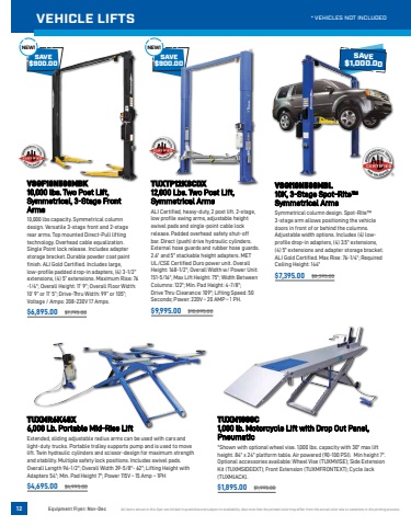 12 Equipment Flyer: Nov-Dec All items shown in this flyer are limited in quantities and subject to availability. Also note that the printed color may differ from the actual color due to variations in the printing process.SAVE$1,000.00SAVE$900.00NEW!SAVE$900.00NEW!VEHICLE LIFTS * VEHICLES NOT INCLUDEDVSGF10N500MBK 10,000 lbs. Two Post Lift, Symmetrical, 3-Stage Front Arms10,000 lbs capacity. Symmetrical column design. Versatile 3-stage front and 2-stage rear arms. Top mounted Direct-Pull lifting technology. Overhead cable equalization. Single Point lock release. Includes adapter storage bracket. Durable powder coat paint finish. ALI Gold Certified. Includes large, low-profile padded drop-in adapters, (4) 3-1/2%u201d extensions, (4) 5%u201d extensions. Maximum Rise: 76 -1/4\ Overall Height: 11%u2019 9%u201d; Overall Floor Width: 10%u2019 9%u201d or 11%u2019 5%u201d; Drive-Thru Width: 99%u201d or 105%u201d; Voltage / Amps: 208-230V 17 Amps. $6,895.00 $7,795.00TUXMR6K48X 6,000 Lb. Portable Mid-Rise LiftExtended, sliding adjustable radius arms can be used with cars and light-duty trucks. Portable trolley supports pump and is used to move lift. Twin hydraulic cylinders and scissor-design for maximum strength and stability. Multiple safety lock positions. Includes swivel pads. Overall Length 96-1/2\Adapters 54\$4,695.00 $4,995.00TUXTP12KSCDX 12,000 Lbs. Two Post Lift, Symmetrical ArmsALI Certified, heavy-duty, 2 post lift. 2-stage, low profile swing arms, adjustable height swivel pads and single-point cable lock release. Padded overhead safety shut-off bar. Direct (push) drive hydraulic cylinders. External hose guards and rubber hose guards. 2.6\UL/CSE Certified Duro power unit. Overall Height: 168-1/2\151-5/16\Columns: 122\Drive Thru Clearance: 109\Seconds; Power: 220V %u2013 20 AMP %u2013 1 PH. $9,995.00 $10,895.00TUXM1000C 1,000 lb. Motorcycle Lift with Drop Out Panel, Pneumatic*Shown with optional wheel vise. 1,000 lbs. capacity with 30\height. 84\Optional accessories available: Wheel Vise (TUXMVISE); Side Extension Kit (TUXMSIDEEXT); Front Extension (TUXMFRONTEXT); Cycle Jack (TUXMJACK). $1,895.00 $1,995.00VSGI10N500MBL 10K, 3-Stage Spot-Rite%u2122 Symmetrical ArmsSymmetrical column design. Spot-Rite%u2122 3-stage arm allows positioning the vehicle doors in front of or behind the columns. Adjustable width options. Includes (4) lowprofile drop-in adapters, (4) 3.5\(4) 5\ALI Gold Certified. Max Rise: 76-1/4\Ceiling Height: 144\$7,395.00 $8,395.00