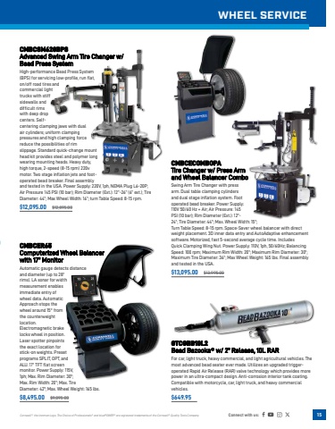 Cornwell%u00ae, the Ironman Logo, The Choice of Professionals%u00ae and bluePOWER%u00ae are registered trademarks of the Cornwell%u00ae Quality Tools Company. Connect with us: 15WHEEL SERVICEGTCGBB10L2 Bead Bazooka%u00ae w/ 2\For car, light truck, heavy commercial, and light agricultural vehicles. The most advanced bead seater ever made. Utilizes an upgraded triggeroperated Rapid Air Release (RAR) valve technology which provides more power in an ultra-compact design. Anti-corrosion interior tank coating. Compatible with motorcycle, car, light truck, and heavy commercial vehicles. $649.95 CMBCER65 Computerized Wheel Balancer with 17\Automatic gauge detects distance and diameter (up to 28\rims). LA sonar for width measurement enables immediate entry of wheel data. Automatic Approach stops the wheel around 15%u00b0 from the counterweight location. Electromagnetic brake locks wheel in position. Laser spotter pinpoints the exact location for stick-on weights. Preset programs SPLIT, OPT, and ALU. 17\monitor. Power Supply: 115V, 1ph; Max. Rim Diameter: 30\Max. Rim Width: 20\Diameter: 42\$8,495.00 $9,095.00CMBCSM628BPS Advanced Swing Arm Tire Changer w/ Bead Press SystemHigh-performance Bead Press System (BPS) for servicing low-profile, run flat, on/off road tires and commercial light trucks with stiff sidewalls and difficult rims with deep drop centers. Selfcentering clamping jaws with dual air cylinders; uniform clamping pressures and high clamping force reduce the possibilities of rim slippage. Standard quick-change mount head kit provides steel and polymer long wearing mounting heads. Heavy duty, high torque, 2-speed (8-15 rpm) 220v motor. Two stage inflation jets and footoperated bead breaker. Final assembly and tested in the USA. Power Supply: 220V, 1ph, NEMA Plug L6-20P; Air Pressure 145 PSI (10 bar); Rim Diameter (Ext.): 12%u201d-26%u201d (6%u201d ext.); Tire Diameter: 44%u201d; Max Wheel Width: 16%u201d; turn Table Speed: 8-15 rpm. $12,095.00 $12,895.00CMBCECOMBOPA Tire Changer w/ Press Arm and Wheel Balancer ComboSwing Arm Tire Changer with press arm. Dual table clamping cylinders and dual stage inflation system. Foot operated bead breaker. Power Supply: 110V 50/60 Hz + Air; Air Pressure: 145 PSI (10 bar); Rim Diameter (Ext.): 12\24\Turn Table Speed: 8-15 rpm. Space-Saver wheel balancer with direct weight placement. 3D inner data entry and AutoAdaptive enhancement software. Motorized, fast 5-second average cycle time. Includes Quick Clamping Wing Nut. Power Supply: 110V, 1ph, 50/60Hz; Balancing Speed: 100 rpm; Maximum Rim Width: 20\Maximum Tire Diameter: 36\and tested in the USA. $13,095.00 $13,995.00