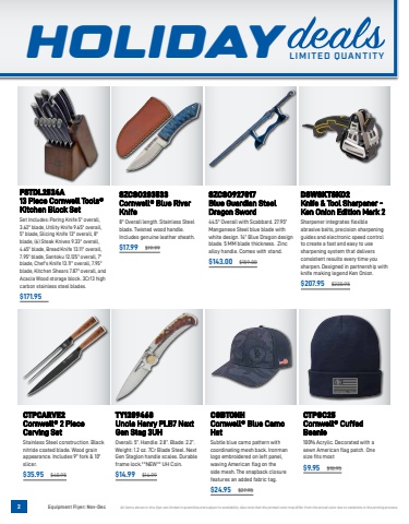 2 Equipment Flyer: Nov-Dec All items shown in this flyer are limited in quantities and subject to availability. Also note that the printed color may differ from the actual color due to variations in the printing process.FSTDL2524A 13 Piece Cornwell Tools%u00ae Kitchen Block SetSet Includes: Paring Knife 5\3.62\5\blade, (6) Steak Knives 9.33\4.65\7.95\blade, Chef's Knife 13.11\blade, Kitchen Shears 7.87\Acacia Wood storage block. 3Cr13 high carbon stainless steel blades. $171.95 DSWSKTSKO2 Knife & Tool Sharpener - Ken Onion Edition Mark 2Sharpener integrates flexible abrasive belts, precision sharpening guides and electronic speed control to create a fast and easy to use sharpening system that delivers consistent results every time you sharpen. Designed in partnership with knife making legend Ken Onion. $207.95 $230.95SZCSO203533 Cornwell%u00ae Blue River Knife8\blade. Twisted wood handle. Includes genuine leather sheath. $17.99 $19.99SZCSO927017 Blue Guardian Steel Dragon Sword44.5\Manganese Steel blue blade with white design. 14\blade. 5 MM blade thickness. Zinc alloy handle. Comes with stand. $143.00 $159.00TY1209468 Uncle Henry PLB7 Next Gen Stag 3UHOverall: 5%u201d. Handle: 2.8%u201d. Blade: 2.2%u201d. Weight: 1.2 oz. 7Cr Blade Steel. Next Gen Staglon handle scales. Durable frame lock.**NEW** UH Coin. $14.99 $16.99CTPCARVE2 Cornwell%u00ae 2 Piece Carving SetStainless Steel construction. Black nitride coated blade. Wood grain appearance. Includes 9\slicer. $35.95 $40.95CTPGC25 Cornwell%u00ae Cuffed Beanie100% Acrylic. Decorated with a sewn American flag patch. One size fits most $9.95 $10.95CGBTONH Cornwell%u00ae Blue Camo HatSubtle blue camo pattern with coordinating mesh back. Ironman logo embroidered on left panel, waving American flag on the side mesh. The snapback closure features an added fabric tag. $24.95 $27.95HOLIDAYdealsLIMITED QUANTITY