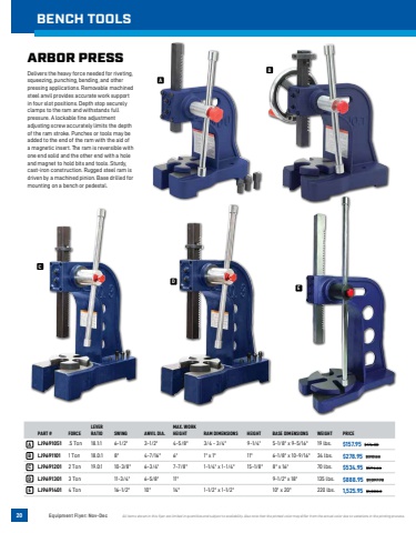 20 Equipment Flyer: Nov-Dec All items shown in this flyer are limited in quantities and subject to availability. Also note that the printed color may differ from the actual color due to variations in the printing process.BENCH TOOLSPART # FORCELEVER RATIO SWING ANVIL DIA.MAX. WORK HEIGHT RAM DIMENSIONS HEIGHT BASE DIMENSIONS WEIGHT PRICELJ9691051 .5 Ton 18.1:1 6-1/2\3-1/2\4-5/8\3/4 - 3/4\9-1/4\5-1/8\19 lbs. $157.95 $176.00LJ9691101 1 Ton 18.0:1 8\4-7/16\6\1\11\6-1/8\34 lbs. $278.95 $310.66LJ9691201 2 Ton 19.0:1 10-3/8\6-3/4\7-7/8\1-1/4\15-1/8\8\70 lbs. $534.95 $594.66LJ9691301 3 Ton 11-3/4\6-5/8\11\9-1/2\135 lbs. $888.95 $1,097.78LJ9691401 4 Ton 16-1/2\10\14\1-1/2\10\220 lbs. 1,525.95 $1,883.3CABDEARBOR PRESSDelivers the heavy force needed for riveting, squeezing, punching, bending, and other pressing applications. Removable machined steel anvil provides accurate work support in four slot positions. Depth stop securely clamps to the ram and withstands full pressure. A lockable fine adjustment adjusting screw accurately limits the depth of the ram stroke. Punches or tools may be added to the end of the ram with the aid of a magnetic insert. The ram is reversible with one end solid and the other end with a hole and magnet to hold bits and tools. Sturdy, cast-iron construction. Rugged steel ram is driven by a machined pinion. Base drilled for mounting on a bench or pedestal.ADCBE