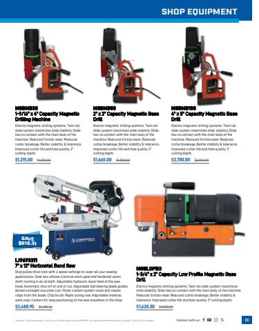 Cornwell%u00ae, the Ironman Logo, The Choice of Professionals%u00ae and bluePOWER%u00ae are registered trademarks of the Cornwell%u00ae Quality Tools Company. Connect with us: 23MGBMB38 1-9/16\Drilling MachineElectro magnetic drilling systems. Twin rail slide system maximizes slide stability. Slide has no contact with the main body of the machine. Reduced friction wear. Reduced cutter breakage. Better stability & tolerance. Improved cutter life and hole quality. 2\cutting depth. $1,215.00 $1,350.00LJ9693311 7\Step pulley drive train with 4 speed settings to cover all your sawing applications. Gear box utilizes a bronze worm gear and hardened worm shaft running in an oil bath. Adjustable hydraulic down feed of the saw head. Automatic shut off at end of cut. Adjustable ball bearing blade guides delivers straight accurate cuts. Flood coolant system cools and cleans chips from the blade. Chip brush. Rapid acting vise. Adjustable material work stop. Castors for easy positioning of the saw anywhere in the shop. $3,488.95 $4,105.26MGBLOPRO 1-3/4\DrillElectro magnetic drilling systems. Twin rail slide system maximizes slide stability. Slide has no contact with the main body of the machine. Reduced friction wear. Reduced cutter breakage. Better stability & tolerance. Improved cutter life and hole quality. 2\$1,620.00 $1,800.00SHOP EQUIPMENTMGBMB100 4\DrillElectro magnetic drilling systems. Twin rail slide system maximizes slide stability. Slide has no contact with the main body of the machine. Reduced friction wear. Reduced cutter breakage. Better stability & tolerance. Improved cutter life and hole quality. 2\cutting depth. $2,700.00 $3,000.00MGBMB50 2\DrillElectro magnetic drilling systems. Twin rail slide system maximizes slide stability. Slide has no contact with the main body of the machine. Reduced friction wear. Reduced cutter breakage. Better stability & tolerance. Improved cutter life and hole quality. 2\cutting depth. $1,665.00 $1,850.00SAVE$616.31