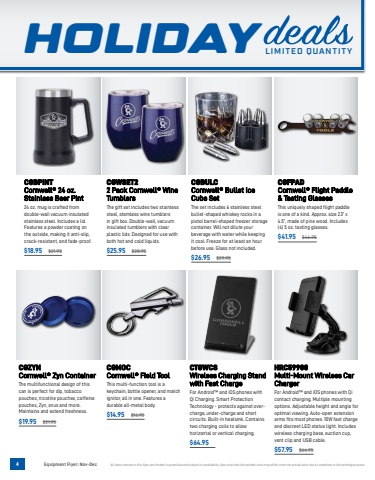 4 Equipment Flyer: Nov-Dec All items shown in this flyer are limited in quantities and subject to availability. Also note that the printed color may differ from the actual color due to variations in the printing process.CGBULC Cornwell%u00ae Bullet Ice Cube SetThe set includes 6 stainless steel bullet-shaped whiskey rocks in a pistol barrel-shaped freezer storage container. Will not dilute your beverage with water while keeping it cool. Freeze for at least an hour before use. Glass not included. $26.95 $29.95CGFPAD Cornwell%u00ae Flight Paddle & Tasting GlassesThis uniquely shaped flight paddle is one of a kind. Approx. size 23%u201d x 4.5%u201d, made of pine wood. Includes (4) 5 oz. tasting glasses. $41.95 $46.95CGBPINT Cornwell%u00ae 24 oz. Stainless Beer Pint24 oz. mug is crafted from double-wall vacuum insulated stainless steel. Includes a lid. Features a powder coating on the outside, making it anti-slip, crack-resistant, and fade-proof. $18.95 $21.95CGWSET2 2 Pack Cornwell%u00ae Wine TumblersThe gift set includes two stainless steel, stemless wine tumblers in gift box. Double-wall, vacuum insulated tumblers with clear plastic lids. Designed for use with both hot and cold liquids. $25.95 $28.95CGMOC Cornwell%u00ae Field ToolThis multi-function tool is a keychain, bottle opener, and match ignitor, all in one. Features a durable all-metal body. $14.95 $16.95CGZYN Cornwell%u00ae Zyn ContainerThe multifunctional design of this can is perfect for dip, tobacco pouches, nicotine pouches, caffeine pouches, Zyn, snus and more. Maintains and extend freshness. $19.95 $21.95HOLIDAYdealsLIMITED QUANTITYHRC59900 Multi-Mount Wireless Car ChargerFor Android%u2122 and iOS phones with Qi contact charging. Multiple mounting options. Adjustable height and angle for optimal viewing. Auto-open extension arms fits most phones. 10W fast charge and discreet LED status light. Includes wireless charging base, suction cup, vent clip and USB cable.$57.95 $64.95CTGWCS Wireless Charging Stand with Fast ChargeFor Android%u2122 and iOS phones with Qi Charging. Smart Protection Technology - protects against overcharge, under-charge and short circuits. Built-in heatsink. Contains two charging coils to allow horizontal or vertical charging. $64.95
