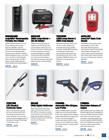 Cornwell%u00ae, the Ironman Logo, The Choice of Professionals%u00ae and bluePOWER%u00ae are registered trademarks of the Cornwell%u00ae Quality Tools Company. Connect with us: 5AUTAL329 AutoLink%u00ae Basic Code ReaderCompatible with domestic, Asian and European vehicles, 1996 and newer. Retrieves generic, manufacturer-specific and pending codes. Reads and displays I/M monitor status. Views freeze frame data. Clears codes, resets monitors and turns off malfunction indicator light (MIL). $59.95 $69.95CTGCT300 LED Circuit & Continuity TesterTest for DC power (B+), ground (B-) and continuity. Smart LED technology illuminates red for power and green for ground and continuity. Patented edge-lighting illuminates Cornwell%u00ae Tools logo. 3.7V-24V test range. $39.95 $44.95SMMOJOAIRE mojoAIRe%u00ae Rechargeable Portable Tire Inflator120 PSI powerful inflation for cars, trucks, motorcycles, bicycles, balls and inflatable products. Automatically stops when desired pressure is reached. Adjustable pressure from 3-120 PSI. 6\hose and adapters store in unit when not in use. Built-in LED flashlight. Able to charge devices via USB-C output. Includes USB cable and presta, needle, and nozzle adapters. $99.95 $109.74THCCJS101 1,000A Jump Starter & OBDII Code Reader1,000 peak amps jump starts most 12V cars, trucks, motorcycles, and boats with reverse polarity protection. Global OBD II coverage to read/erase trouble codes, view live data, freeze frame and I/M readiness tests. Built-in LED flashlight. 12,000mAh battery and USB ports to charge personal devices. $129.95 $139.95NOCAX65 2000A Jump Starter + 22A Air Inflator2000A jump starting power for engines up to 8.0-liter gas and 6.0-liter diesel. Inflate tires in as little as 1.5 minutes. Inflation stops at the set pressure for precise accuracy. Designed for rugged environments with rubberized port covers and anti-vibration feet. Manual override to start dead batteries. Built-in LED flashlight. $374.95 CTGAWSL Automatic Wire Stripper, Low-ProfileStrips 24-10AWG solid or stranded copper wire. Automatically adjusts to wire size. Hardened steel stripping blades. Adjustable strip length guide 8-12mm. Low-profile design to access small spaces. Built-in wire cutter cuts up to 14AWG wire. Safety lock keeps stripper in closed position for storage. $29.95 $39.95CTGES8A Electrician Scissors, 8%u201d AngledHigh-hardness, precision blades with serrated edge prevents slippage and cuts up to 10 AWG aluminum/copper wires. Also cuts cable ties, tape and plastic. Integrated cable cutter cuts soft cable up to 000 (3/0) AWG. Built-in 22-10 AWG wire stripper and terminal crimper. Spring-loaded action with safety lock. $49.95 $59.95ESC485 10M%u03a9 Digital MultimeterMeasures DC & AC volts, ohms, amps, continuity and transistor hFE. 10M Ohm impedance, audible continuity test, fuse-protected 10A range and low battery indication. Includes protective cover with lead holsters and 9V battery. $39.95