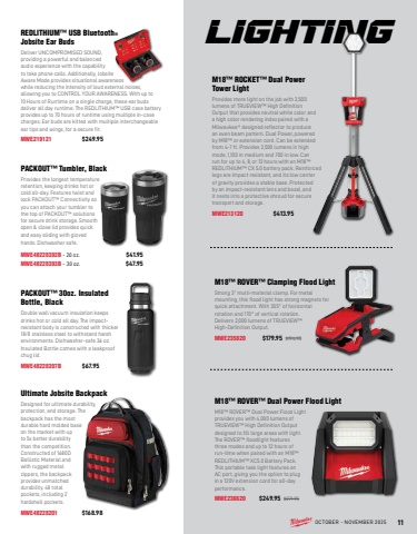 NOTE: All items shown in this flyer are limited in quantities and subject to availability. Also note the printed color may differ from the actual color due to variations in the printing process. OCTOBER - NOVEMBER 2025 11REDLITHIUM%u2122 USB Bluetooth%u00aeJobsite Ear BudsDeliver UNCOMPROMISED SOUND, providing a powerful and balanced audio experience with the capability to take phone calls. Additionally, Jobsite Aware Mode provides situational awareness while reducing the intensity of loud external noises, allowing you to CONTROL YOUR AWARENESS. With up to 10 Hours of Runtime on a single charge, these ear buds deliver all day runtime. The REDLITHIUM%u2122 USB case battery provides up to 70 hours of runtime using multiple in-case charges. Ear buds are kitted with multiple interchangeable ear tips and wings, for a secure fit.MWE219121 $249.95 M18%u2122 ROVER%u2122 Clamping Flood LightStrong 3%u201d multi-material clamp. For metal mounting, this flood light has strong magnets for quick attachment. With 355%u00b0 of horizontal rotation and 170%u00b0 of vertical rotation. Delivers 2,000 lumens of TRUEVIEW%u2122 High-Definition Output.MWE235820 $179.95 $194.95M18%u2122 ROVER%u2122 Dual Power Flood LightM18%u2122 ROVER%u2122 Dual Power Flood Light provides you with 4,000 lumens of TRUEVIEW%u2122 High Definition Output designed to fill large areas with light. The ROVER%u2122 floodlight features three modes and up to 12 hours of run-time when paired with an M18%u2122 REDLITHIUM%u2122 XC5.0 Battery Pack. This portable task light features an AC port, giving you the option to plug in a 120V extension cord for all-day performance.MWE236620 $249.95 $271.95Ultimate Jobsite BackpackDesigned for ultimate durability, protection, and storage. The backpack has the most durable hard molded base on the market with up to 5x better durability than the competition. Constructed of 1680D Ballistic Material and with rugged metal zippers, the backpack provides unmatched durability. 48 total pockets, including 2 hardshell pockets.MWE48228201 $168.98 PACKOUT%u2122 30oz. Insulated Bottle, BlackDouble wall vacuum insulation keeps drinks hot or cold all day. The impactresistant body is constructed with thicker 18/8 stainless steel to withstand harsh environments. Dishwasher-safe 36 oz. Insulated Bottle comes with a leakproof chug lid.MWE48228397B $67.95 LIGHTINGM18%u2122 ROCKET%u2122 Dual Power Tower LightProvides more light on the job with 2,500 lumens of TRUEVIEW%u2122 High Definition Output that provides neutral white color and a high color rendering index paired with a Milwaukee%u00ae designed reflector to produce an even beam pattern. Dual Power, powered by M18%u2122 or extension cord. Can be extended from 4-7 ft. Provides 2,500 lumens in high mode, 1,100 in medium and 700 in low. Can run for up to 4, 8, or 12 hours with an M18%u2122 REDLITHIUM%u2122 CX 5.0 battery pack. Reinforced legs are impact resistant, and its low center of gravity provides a stable base. Protected by an impact-resistant lens and bezel, and it nests into a protective shroud for secure transport and storage.MWE213120 $413.95 PACKOUT%u2122 Tumbler, BlackProvides the longest temperature retention, keeping drinks hot or cold all-day. Features twist and lock PACKOUT%u2122 Connectivity so you can attach your tumbler to the top of PACKOUT%u2122 solutions for secure drink storage. Smooth open & close lid provides quick and easy sliding with gloved hands. Dishwasher safe.MWE48228392B - 20 oz. $41.95 MWE48228393B - 30 oz. $47.95 OCTOBER - NOVEMBER 2025 11