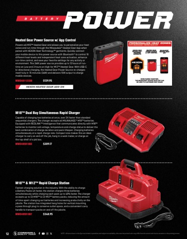 12 NOTE: All items shown in this flyer are limited in quantities and subject to availability. Also note the printed color may differ from the actual color due to variations in the printing process. Heated Gear Power Source w/ App ControlPowers all M12%u2122 Heated Gear and allows you to personalize your heat zones and run-time through the Milwaukee%u00ae Heated Gear App when paired with HEXON Heat Technology%u2122 garments. Quickly connect your mobile device to this power source with Bluetooth%u00ae to control 10 different heat levels and independent heat zone activation, enhance run-time control, and save your favorite settings for any activity or environment. This 36W power source provides up to 12 hours of runtime on Low and 3 hours on High for M12%u2122 Heated Gear. With USB-C bi-directional charging, the Heated Gear Power Source re-charges itself fully in 70 minutes (36W) and delivers 15W output to charge mobile devices.MWE48112330 - $139.95 M18%u2122 Dual Bay Simultaneous Rapid ChargerCapable of charging two batteries at once, over 3X faster than standard sequential chargers. The charger accepts all MILWAUKEE%u00ae M18%u2122 batteries. Equipped with REDLINK%u2122 Intelligence that communicates directly with M18%u2122 batteries to monitor cell voltage, temperature and charge status to deliver the best combination of charge duration and pack lifespan. Charging batteries simultaneously at a rapid charge rate. Compact size makes this an ideal charger to carry on and off the job, hang in a work trailer, or charge on the top shelf of a job box.MWE48591802 $209.17 M18%u2122 & M12%u2122 Rapid Charge StationFastest charging solution in the industry. With the ability to charge 6 Battery Packs 4X faster, the station charges three batteries simultaneously while charging each pack up to 40% faster. The charger accepts up to (3) M18%u2122 & (3) M12%u2122 battery packs, reducing the amount of time spent changing out batteries and increasing productivity on the jobsite. The station has integrated hang holes for vertical mounting, a pass through plug to conserve outlet space, and a convenient carry handle to transport packs on and off the jobsite.MWE48591807 $348.95 12 NOTE: All items shown in this flyer are limited in quantities and subject to availability. Also note the printed color may differ from the actual color due to variations in the printing process. BATTERY POWERHEXON HEATED GEAR ADD-ON