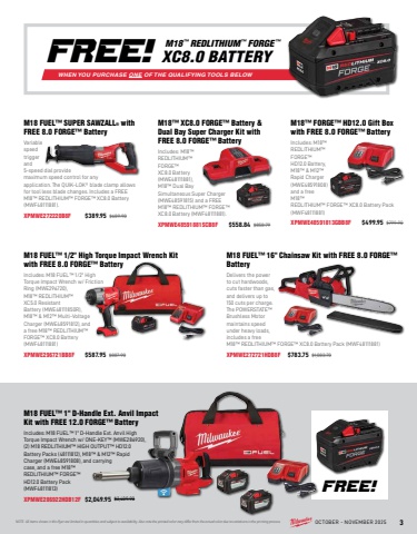 NOTE: All items shown in this flyer are limited in quantities and subject to availability. Also note the printed color may differ from the actual color due to variations in the printing process. OCTOBER - NOVEMBER 2025 3M18 FUEL%u2122 1\Kit with FREE 12.0 FORGE%u2122 BatteryIncludes: M18 FUEL%u2122 1\Torque Impact Wrench w/ ONE-KEY%u2122 (MWE286920), (2) M18 REDLITHIUM%u2122 HIGH OUTPUT%u2122 HD12.0 Battery Packs (48111812), M18%u2122 & M12%u2122 Rapid Charger (MWE48591808), and carrying case, and a free M18%u2122 REDLITHIUM%u2122 FORGE%u2122 HD12.0 Battery Pack (MWF48111813)XPMWE286922HDB12F $2,049.95 $2,409.90NOTE: All items shown in this flyer are limited in quantities and subject to availability. Also note the printed color may differ from the actual color due to variations in the printing process. OCTOBER - NOVEMBER 2025 3FREE!FREE! XC8.0 BATTERYWHEN YOU PURCHASE ONE OF THE QUALIFYING TOOLS BELOWM18%u2122 REDLITHIUM%u2122 FORGE%u2122M18 FUEL%u2122 SUPER SAWZALL%u00ae with FREE 8.0 FORGE%u2122 BatteryVariable speed trigger and 5-speed dial provide maximum speed control for any application. The QUIK-LOK%u00ae blade clamp allows for tool less blade changes. Includes a FREE M18%u2122 REDLITHIUM%u2122 FORGE%u2122 XC8.0 Battery (MWF48111881).XPMWE272220B8F $389.95 $689.90M18%u2122 XC8.0 FORGE%u2122 Battery & Dual Bay Super Charger Kit with FREE 8.0 FORGE%u2122 BatteryIncludes: M18%u2122 REDLITHIUM%u2122 FORGE%u2122 XC8.0 Battery (MWE48111881), M18%u2122 Dual Bay Simultaneous Super Charger (MWE48591815) and a FREE M18%u2122 REDLITHIUM%u2122 FORGE%u2122 XC8.0 Battery (MWF48111881).XPMWE48591881SCB8F $558.84 $858.79M18 FUEL%u2122 16\BatteryDelivers the power to cut hardwoods, cuts faster than gas, and delivers up to 150 cuts per charge. The POWERSTATE%u2122 Brushless Motor maintains speed under heavy loads, includes a free M18%u2122 REDLITHIUM%u2122 FORGE%u2122 XC8.0 Battery Pack (MWF48111881)XPMWE272721HDB8F $783.75 $1,083.70M18%u2122 FORGE%u2122 HD12.0 Gift Box with FREE 8.0 FORGE%u2122 BatteryIncludes: M18%u2122 REDLITHIUM%u2122 FORGE%u2122 HD12.0 Battery, M18%u2122 & M12%u2122 Rapid Charger (MWE48591808) and a free M18%u2122 REDLITHIUM%u2122 FORGE%u2122 XC8.0 Battery Pack (MWF48111881)XPMWE48591813GBB8F $499.95 $799.90M18 FUEL%u2122 1/2\with FREE 8.0 FORGE%u2122 BatteryIncludes: M18 FUEL%u2122 1/2\Torque Impact Wrench w/ Friction Ring (MWE296720), M18%u2122 REDLITHIUM%u2122 XC5.0 Resistant Battery (MWE48111850R), M18%u2122 & M12%u2122 Multi-Voltage Charger (MWE48591812), and a free M18%u2122 REDLITHIUM%u2122 FORGE%u2122 XC8.0 Battery (MWF48111881)XPMWE296721BB8F $587.95 $887.90