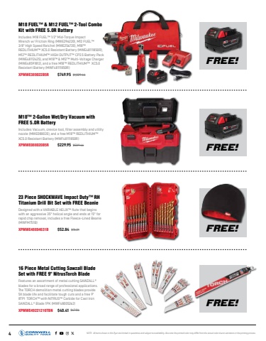 4 NOTE: All items shown in this flyer are limited in quantities and subject to availability. Also note the printed color may differ from the actual color due to variations in the printing process. M18%u2122 2-Gallon Wet/Dry Vacuum with FREE 5.0R BatteryIncludes: Vacuum, crevice tool, filter assembly and utility nozzle (MWE088020), and a free M18%u2122 REDLITHIUM%u2122 XC5.0 Resistant Battery (MWF48111850R)XPMWE088020B5R $229.95 $509.4623 Piece SHOCKWAVE Impact Duty%u2122 RH Titanium Drill Bit Set with FREE BeanieDesigned with a VARIABLE HELIX%u2122 flute that begins with an aggressive 35%u00b0 helical angle and ends at 15%u00b0 for rapid chip removal, includes a free Fleece-Lined Beanie (MWFM751B)XPMWE48894631B $52.84 $76.2116 Piece Metal Cutting Sawzall Blade Set with FREE 9\Features an assortment of metal cutting SAWZALL%u00ae blades for a broad range of professional applications. The TORCH demolition metal cutting blades provide 5X blade life and facilitate tough cuts and a free 9\8TPI TORCH%u2122 with NITRUS%u2122 Carbide for Cast Iron SAWZALL%u00ae Blade 1PK (MWF48005262)XPMWE49221216TBN $40.41 $67.04FREE!FREE!FREE!M18 FUEL%u2122 & M12 FUEL%u2122 2-Tool Combo Kit with FREE 5.0R BatteryIncludes: M18 FUEL%u2122 1/2\Wrench w/ Friction Ring (MWE296220), M12 FUEL%u2122 3/8\REDLITHIUM%u2122 XC5.0 Resistant Battery (MWE48111850R), M12%u2122 REDLITHIUM%u2122 HIGH OUTPUT%u2122 CP2.5 Battery Pack (MWE48112425), and M18%u2122 & M12%u2122 Multi-Voltage Charger (MWE48591812), and a free M18%u2122 REDLITHIUM%u2122 XC5.0 Resistant Battery (MWF48111850R)XPMWE389022B5R $749.95 $1,029.46FREE!