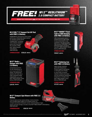 NOTE: All items shown in this flyer are limited in quantities and subject to availability. Also note the printed color may differ from the actual color due to variations in the printing process. OCTOBER - NOVEMBER 2025 5FREE!WHEN YOU PURCHASE ONE OF THE QUALIFYING TOOLS BELOWM12%u2122 REDLITHIUM%u21222.0 COMPACT BATTERYM12%u2122 Compact Spot Blower with FREE 2.0 BatteryFeatures high and low-speed settings, a lock-on button, and a variable speed trigger for increased control. It%u2019s compact size allows for greater access, maneuverability in tight spaces, and easy storage, includes a free M12%u2122 REDLITHIUM%u2122 CP2.0 Battery (MWF48112420)XPMWE085220B2 $150.30 $245.25M12 FUEL%u2122 3\with FREE 2.0 Battery20,000 RPM for fast and accurate cutting performance. Reversible blade rotation for ultimate cutting control. POWERSTATE%u2122 brushless motor delivers maximum power and long motor life. Includes a FREE M12%u2122 REDLITHIUM%u2122 CP2.0 Battery (MWF48112420)XPMWE252220B2 $210.48 $305.43M12%u2122 Radio + Charger with FREE 2.0 BatteryUnmatched sound for its size, allowing you to turn it up on and off the jobsite. This Bluetooth%u00ae speaker with radio has a sleek integrated design (MWE295120) and a free M12%u2122 REDLITHIUM%u2122 CP2.0 Battery (MWF48112420).XPMWE295120B2$219.95 $314.90M12%u2122 ROVER%u2122 Flood Light w/ USB Charging with FREE 2.0 BatteryUSB charging gives users a flexible source of light made for any environment, in any orientation. The light provides 700 lumens of TRUEVIEW%u2122 High Definition Output, includes a free M12%u2122 REDLITHIUM%u2122 CP2.0 Battery (MWF48112420)XPMWE236720B2$108.01 $202.96M12%u2122 Soldering Iron with FREE 2.0 BatteryHeats quickly, maintains optimized temperature. Protects against overheating or damaging wires. Readyto-use & safe-to-remove indicator notifies users when tool has reached an operational temperature, includes a free M12%u2122 REDLITHIUM%u2122 CP2.0 Battery (MWF48112420)XPMWE248820B2$172.95 $267.90NOTE: All items shown in this flyer are limited in quantities and subject to availability. Also note the printed color may differ from the actual color due to variations in the printing process. OCTOBER - NOVEMBER 2025 5