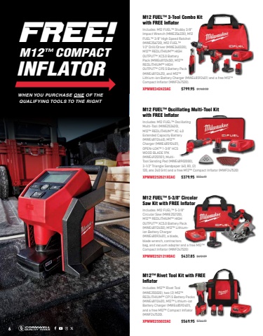 6 NOTE: All items shown in this flyer are limited in quantities and subject to availability. Also note the printed color may differ from the actual color due to variations in the printing process. FREE!M12%u2122 COMPACT INFLATORM12 FUEL%u2122 Oscillating Multi-Tool Kit with FREE InflatorIncludes: M12 FUEL%u2122 Oscillating Multi-Tool (MWE252620), M12%u2122 REDLITHIUM%u2122 XC 4.0 Extended Capacity Battery (MWE48112440), M12%u2122 Charger (MWE48592401), OPEN-LOK%u2122 1-3/8\WOOD BLADE 1PK (MWE49251101), MultiTool Sanding Pad (MWE48902000), 3-1/2\120, ans 240 Grit) and a free M12%u2122 Compact Inflator (MWF247520)XPMWE252621XCAC $379.95 $554.19M12%u2122 Rivet Tool Kit with FREE InflatorIncludes: M12%u2122 Rivet Tool (MWE255020), two (2) M12%u2122 REDLITHIUM%u2122 CP1.5 Battery Packs (MWE48112401), M12%u2122 Lithium-ion Battery Charger (MWE48592401), and a free M12%u2122 Compact Inflator (MWF247520).XPMWE255022AC $569.95 $744.19M12 FUEL%u2122 5-3/8\Saw Kit with FREE InflatorIncludes: M12 FUEL%u2122 5-3/8\Circular Saw (MWE252120), M12%u2122 REDLITHIUM%u2122 HIGH OUTPUT%u2122 XC5.0 Battery Pack (MWE48112450), M12%u2122 Lithiumion Battery Charger (MWE48592401), a blade, blade wrench, contractors bag, and vacuum adapter and a free M12%u2122 Compact Inflator (MWF247520)XPMWE252121HOAC $437.85 $612.09M12 FUEL%u2122 3-Tool Combo Kit with FREE InflatorIncludes: M12 FUEL%u2122 Stubby 3/8\Impact Wrench (MWE256220), M12 FUEL%u2122 3/8\(MWE256720), M12 FUEL%u2122 1/2\M12%u2122 REDLITHIUM%u2122 HIGH OUTPUT%u2122 XC5.0 Battery Pack (MWE48112450), M12%u2122 REDLITHIUM%u2122 HIGH OUTPUT%u2122 CP2.5 Battery Pack (MWE48112425), and M12%u2122 Lithium-ion Battery Charger (MWE48592401) and a free M12%u2122 Compact Inflator (MWF247520).XPMWE342423AC $799.95 $1,168.38WHEN YOU PURCHASE ONE OF THE QUALIFYING TOOLS TO THE RIGHT6