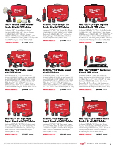 NOTE: All items shown in this flyer are limited in quantities and subject to availability. Also note the printed color may differ from the actual color due to variations in the printing process. OCTOBER - NOVEMBER 2025 7M12%u2122 Variable Speed Polisher/Sander Kit with FREE InflatorIncludes: M12%u2122 Variable Speed Polisher/Sander (MWE243820), M12%u2122 Battery Charger (MWE48592401), M12%u2122 XC High Capacity REDLITHIUM%u2122 Battery (MWE48112402), M12%u2122 REDLITHIUM%u2122 CP1.5 Battery (MWE48112401) with a free M12%u2122 Compact Inflator (MWF247520)XPMWE243822XAC $327.95 $502.19M12 FUEL%u2122 1/4\Grinder Kit with FREE InflatorIncludes: M12 FUEL%u2122 1/4\(MWE248620), (2) M12%u2122 REDLITHIUM%u2122 CP2.0 Batteries (MWE48112420), M12%u2122 Lithium-Ion Battery Charger (MWE48592401) with a free M12%u2122 Compact Inflator (MWF247520)XPMWE248622AC $459.95 $634.19M12 FUEL%u2122 3/8\with FREE InflatorIncludes: M12 FUEL%u2122 3/8%u201d Stubby Impact Wrench (0-3,000 RPM / 550 ft.-lbs. Torque / 2.2 lbs.) (MWE256220), M12%u2122 REDLITHIUM%u2122 HIGH OUTPUT%u2122 CP2.5 Battery (MWE48112425), M12%u2122 REDLITHIUM%u2122 HIGH OUTPUT%u2122 XC5.0 Battery (MWE48112450), M12%u2122 Charger (MWE48592401) with a free M12%u2122 Compact Inflator (MWF247520)XPMWE256222AC $499.95 $674.19M12 FUEL%u2122 1/2\with FREE InflatorIncludes: M12 FUEL%u2122 1/2%u201d Stubby Impact Wrench (0-3,000 RPM / 550 ft.-lbs. Torque / 2.2 lbs.) (MWE256320), M12%u2122 REDLITHIUM%u2122 HIGH OUTPUT%u2122 CP2.5 Battery (MWE48112425), M12%u2122 REDLITHIUM%u2122 HIGH OUTPUT%u2122 XC5.0 Battery (MWE48112450), M12%u2122 Charger (MWE48592401) and a free M12%u2122 Compact Inflator (MWF247520)XPMWE256322AC $499.95 $674.19M12 FUEL%u2122 3/8\Impact Wrench with FREE InflatorIncludes: M12 FUEL%u2122 3/8\Wrench (MWE256420), (2) M12%u2122 REDLITHIUM%u2122 CP2.0 Batteries (MWE48112420), M12%u2122 charger (MWE48592401) and a free M12%u2122 Compact Inflator (MWF247520)XPMWE256422AC $509.95 $684.19M12 FUEL%u2122 1/2\Impact Wrench with FREE InflatorIncludes: M12 FUEL%u2122 1/2\Wrench (MWE256520), (2) M12%u2122 REDLITHIUM%u2122 CP2.0 batteries (MWE48112420), M12%u2122 charger (MWE48592401) and a free M12%u2122 Compact Inflator (MWF247520)XPMWE256522AC $509.95 $684.19M12 FUEL%u2122 3/8\Ratchet Kit with FREE InflatorIncludes: M12 FUEL%u2122 3/8\Ratchet (MWE256020), M12%u2122 REDLITHIUM%u2122 CP2.0 Battery (MWE48112420), M12%u2122 Lithium-ion Battery Charger (MWE48592401) and a FREE M12%u2122 Compact Inflator (MWF247520)XPMWE256921AC $429.95 $604.19M12 FUEL%u2122 INSIDER%u2122 Box Ratchet Kit with FREE InflatorIncludes: M12 FUEL%u2122 INSIDER%u2122 Extended Reach Box Ratchet (MWE305020), M12%u2122 Charger (MWE48592401), M12%u2122 HIGH OUTPUT%u2122 CP 2.5Ah Battery (MWE48112425), Socket Rail, Metric Socket Set (8-19mm, 21mm), 1/4%u201d Hex Adapter, 1/4 Drive Anvil Adapter, 3/8%u201d Drive Anvil Adapter and a free M12%u2122 Compact Inflator (MWF247520)XPMWE305021AC $529.95 $704.19M12 FUEL%u2122 1/4\Grinder Kit with FREE InflatorIncludes: M12 FUEL%u2122 1/4\(MWE348520), M12%u2122 REDLITHIUM%u2122 High Output CP2.5 Battery (MWE48112425), M12%u2122 REDLITHIUM%u2122 High Output XC 5.0 Battery (MWE48112450), and M12%u2122 Lithium-ion Battery Charger (MWE48592401) and a free M12%u2122 Compact Inflator (MWF247520)XPMWE348522AC $499.95 $674.19
