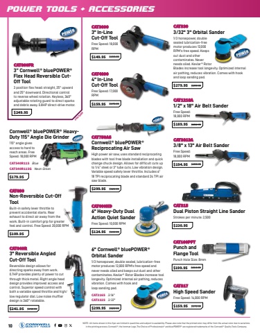 10 NOTE: All items shown in this flyer are limited in quantities and subject to availability. Please also note that the printed color may differ from the actual color due to variationsin the printing process. Cornwell%u00ae, the Ironman Logo, The Choice of Professionals%u00ae and bluePOWER%u00ae are registered trademarks of the Cornwell%u00ae Quality Tools Company.POWER TOOLS + ACCESSORIESFEATURECornwell%u00ae bluePOWER%u00ae HeavyDuty 115%u00b0 Angle Die Grinder115%u00b0 angle gives access to hard to reach areas. Free Speed: 18,000 RPMCAT540R115 Blue$179.95 CAT540R115G Neon GreenCAT830 Non-Reversible Cut-Off ToolBuilt-in safety lever throttle to prevent accidental starts. Rear exhaust to direct air away from the work. Built-in comfort grip for greater feel and control. Free Speed: 20,000 RPM$109.95 CAT3090 3\Cut-Off ToolFree Speed: 18,000 RPM$149.95 $159.95 CAT840R 3\Cut-Off ToolReversible design allows for directing sparks away from work. 0.7HP provides plenty of power to cut through thick metal. Right angle head design provides improved access and control. Superior speed control with both a variable speed throttle and high/low regulator dial. Low noise muffler design is 360%u00b0 rotatable.$241.95 $258.95 CAT4090 4\Cut-Off ToolFree Speed: 17,000 RPM$159.95 $170.95 CAT750AS Cornwell%u00ae bluePOWER%u00ae Reciprocating Air SawHigh power air saw, uses standard reciprocating blades with tool free blade installation and quick change chuck design. Allows for difficult cuts up to 1/4\Variable speed safety lever throttle. Includes 6\18 TPI reciprocating blade and standard 24 TPI air saw blade.$299.95 $320.95 CAT1218A 1/2\Free Speed: 18,000 RPM$189.95 $202.95 CAT3813A 3/8\Free Speed: 18,000 RPM$194.95 $208.95 CAT330 3/32\1/3 horsepower, double sealed lubrication-free motor produces 12,000 RPM's free speed. Keeps out dust and other contaminates. Never needs oiled. Kevlar%u00ae Rotor Blades increase tool longevity. Optimized internal air pathing, reduces vibration. Comes with hook and loop sanding pad.$279.95 $299.95 CAT317 High Speed SanderFree Speed: 14,000 RPM$159.95 $170.95 CAT315 Dual Piston Straight Line SanderStrokes per minute: 2,500$230.95 CAT100PFT Punch and Flange ToolPunch Hole Size: 8mm$199.95 $213.95 CAT600HD 6\Action Quiet SanderFree Speed: 10,000 RPM$124.95 $133.95 6\Orbital Sander1/3 horsepower, double sealed, lubrication-free motor produces 12,000 RPM's free speed and never needs oiled and keeps out dust and other contaminates. Kevlar%u00ae Rotor Blades increase tool longevity. Optimized internal air pathing, reduces vibration. Comes with hook and loop sanding pad.CAT3165 3/16\$299.95 $320.95 CAT3325 3/32\CAT800FR 3%u201d Cornwell%u00ae bluePOWER%u00ae Flex Head Reversible CutOff Tool3 position flex head: straight, 25%u00b0 upward and 25%u00b0 downward. Directional control to reverse wheel rotation. Keyless, 360%u00b0 adjustable rotating guard to direct sparks and debris away. 0.8HP direct-drive motor.$249.95