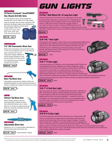 OCTOBER FLYER 2025 11 NOTE: All items shown in this flyer are limited in quantities and subject to availability. Please also note that the printed color may differ from the actual color due to variationsin the printing process. Cornwell%u00ae, the Ironman Logo, The Choice of Professionals%u00ae and bluePOWER%u00ae are registered trademarks of the Cornwell%u00ae Quality Tools Company.CATPRG14HD 1/4\Works with conventional, structural blind rivets, t-rivets, and monobolts up to 1/4%u201d in all material types. Includes 3/16%u201d and 1/4%u201d nose pieces. Nearly 4,000 lbs. of traction power. Storage for nose pieces located at the base of the tool. Forged aluminum handle for strength and durability.$469.95 $502.95 CBP12HEXS 12 Piece Cornwell%u00ae bluePOWER%u00ae Hex Shank Drill Bit Sets1/4\standard drill chucks. Made of M-2 high speed steel for strength, heat and wear resistance. 135%u00b0 split point tip design requires less drilling force and minimizes walking. Includes quick change adapter. Sizes: one (1) each 1/16\7/64\7/32\$37.95 $44.95 CAT1162A Bent Tip Blow GunLightweight, sturdy body for added comfort and durability. Resistant to most automotive fluids and solvents. Variable flow trigger for precise air control.$28.95 $40.95 13\CAT18603A Adjustable Blow GunDesigned to fit 1/4%u201d coupler bodies. Adjustable air flow. Knurled nozzle and pocket clip.$11.95 $13.95 Industrial/Milton%u00ae Design STL69424 TLR-7%u00ae X Gun LightPowered by either one (1) CR123A or one (1) Streamlight SL-B9%u2122 lithium-ion rechargeable battery pack. Integrated rail clamp is designed to rapidly attach/detach from the side of the weapon, providing smooth installation and removal. Customizable rear paddle switches, momentary and constant on operation, and a programmable strobe mode. 500 lumens; 5,000 candela; 140m beam; runs 1.5 hours. TIR optic produces a concentrated beam with optimum peripheral illumination. IPX7 waterproof to 1m for 30 minutes. 6000 Series machined aircraft aluminum construction. Safe off feature prevents accidental activation; saves batteries.$260.95 $284.10 Black STL69260 TLR-1 HL%u00ae Gun LightFits handguns and long-guns. Strobe mode can be enable/disabled. 1000 lumens and 285 meter beam. Rail grip clamp system securely attaches quickly and safely with no tools. Mounts directly to handguns with Glock-style rails and Picatinny rails. Ambidextrous momentary/steady on/off switch. Durable machined aluminum. IPX7 waterproof to 1 meter for 30 minutes. Fits existing light bearing holsters.$273.95 Black STL69400 TLR-7%u00ae X Sub Gun LightSecurely attaches to GLOCK%u00ae 43X MOS/48 MOS and GLOCK%u00ae 43X RAIL/48 RAIL subcompact handguns. Attaches/detaches quickly and safely with no tools. Features a \paddle switches. Multi-fuel battery capability %u2014 powered by either one (1) CR123A or one (1) Streamlight SL-B9%u00ae lithium-ion rechargeable battery pack. 500 lumens; 140m beam; runs 1.5 hours. Ambidextrous rear switch. Durable, anodized machined aluminum construction.$260.95 $284.10 Black STL69434 TLR-8%u00aeA G Gun LightCustomized ergonomic rear switches featuring a low or high position. 500 lumens of white light and a green laser for performance night and day, it securely fits a broad range of full-size and compact handguns. The green laser is visible even in daylight. Low-profile design prevents snagging and a %u201csafe off%u201d feature prevents accidental activation, saving batteries. Features rear paddle switches with HIGH and LOW options. 500 lumens; 140m beam; runs 1.5 hours (light only or light/laser combo). Laser only runs 11 hours. TLR-8G side switch model cannot be retrofitted to the TLR-8A G rear switch models. CR123A lithium battery (included).$519.95 $566.29 Black STL88066 ProTac%u00ae Rail Mount HL-X Long Gun LightDedicated fixed-mount for Picatinny rails. Lightweight, can be used in close quarters. Uses either a remote switch or a standard pushbutton tail switch (both included), and can run on multiple battery sources. 1,000 lumens and 447 meter beam on High. Switch to Low mode for 21 hours runtime. Accepts (2) CR123A batteries or (1) Streamlight SL-B26 protected Li-Ion battery pack. High/Low/Strobe modes. TEN-TAP%u00ae Programming to choose your preferred operating mode. Fits long guns with MIL-STD 1913 rails.$219.95 CATVB Venturi Tip Blow GunVenturi design creates a vacuum which generates a greater air blast than standard blow gun tips or tubes. Ideal for car exterior & engine bay drying, shop floor cleaning, and debris removal.$30.95 $34.95 GUN LIGHTS