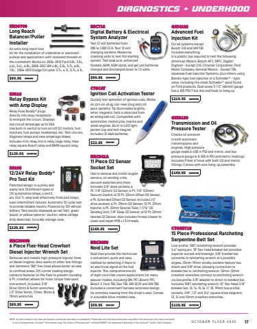 OCTOBER FLYER 2025 17 NOTE: All items shown in this flyer are limited in quantities and subject to availability. Please also note that the printed color may differ from the actual color due to variationsin the printing process. Cornwell%u00ae, the Ironman Logo, The Choice of Professionals%u00ae and bluePOWER%u00ae are registered trademarks of the Cornwell%u00ae Quality Tools Company.DIAGNOSTICS + UNDERHOODES316 Relay Bypass Kit with Amp DisplayRelay Fuse Buddy%u00ae plugs directly into relay receptacle to energize the circuit. Displays live circuit amperage up to 30A. Use built-in switch to turn on/off DC motors, fuel injectors, fuel pumps, headlamps, etc. Test circuits, diagnose relays and view amperage draws. Includes mini relay, micro relay, large relay, maxi relay square Bosch relay and BMW square relay.$129.95 $149.95 ES195 12/24V Relay Buddy%u00ae Pro Test KitPatented design to quickly and easily test 10 different types of 12V automotive relays, 4 and 5 pin. Full 7+ amp load effectively finds bad relays, even intermittent failures. Automatic 10 cycle test to provide reliable results. Powered by 12V vehicle battery. Test results displayed as red (fail), green (pass), or yellow (pass w/ caution, some voltage drop detected). Includes storage case.$229.95 $269.95 ESC718 Digital Battery & Electrical System AnalyzerTest 12 volt batteries from 200 to 1200 CCA. Test 12 volt charging systems. Measures cranking volts to test the starting system. Test lead acid, enhanced flooded, AGM, AGM spiral, and gel cell batteries charged and discharged down to 1.5 volts.$99.95 $119.95 CTGCAT Ignition Coil Activation TesterQuickly test operation of ignition coils. Works on coil-on-plug, coil-near plug and coil pack systems. Tip illuminates brightly when magnetic field is detected from an energized coil. Compatible with automotive, motorcycle, marine and small engines. Built-in LED light, pocket clip and test magnet. Includes (2) AAA batteries.$22.95 $28.95 GSI4225 Advanced Fuel Injection KitFor all systems except Bosch CIS and GM TBI. Includes everything in a plastic box required to test the following: American Motors, Bosch AFC, MPC, Digijet/Digifant - Except CIS, Chrysler Corporation, Ford Motor Company, General Motors - Except TBI, Japanese Fuel Injection Systems, plus others using Bendix-type fuel injection or a Schrader%u00ae - type valve, including the small Schrader%u00ae valve found on Ford products. Dual scale 2-1/2%u201d (65mm) gauge has a 100 PSI/7 bar dial and hook to hang up.$219.95 $249.95 HRC3050 Noid Lite SetNoid lites provide the technician a convenient, quick and easy method for detecting if there is an electrical signal at the fuel injector. This comprehensive kit of eight noid lites covers applications for many popular makes, including GM, PFI, Bosch PFI, Bosch 2, Ford TBI, Geo TBI, GM SCPI and GM TBI. Includes a convenient harness extension design for remotely viewing from the driver%u2019s seat. Comes in a durable blow-molded case.$59.95 $69.99 HRC841A 11 Piece O2 Sensor Socket SetUse to remove and install oxygen sensors, oil sending units, vacuum switches and more. Includes 3/8%u201d drive sockets: 6 Pt. 7/8%u201d (22mm) O2 Sensor; 6 Pt. 7/8%u201d (22mm) Vacuum Switch; 6/12 Pt. 22mm Offset O2 Sensor; 6 Pt. Extended Offset O2 Sensor. Includes 1/2%u201d drive sockets: 6 Pt. 29mm O2 Sensor; 12 Pt. 27mm Injector; 6 Pt. 22mm Special Tube; 1-1/16%u201d Oil Sending Unit; 7/8%u201d Deep O2 Sensor; 6/12 Pt. 22mm Heated O2 Sensor. Also includes thread chaser to clean and repair M18 x 1.5 threads.$169.95 $189.95 GSI3150 Transmission and Oil Pressure TesterChecks oil pressure in both automatic transmissions and engines. High pressure gauge reads 0-400 in PSI and metric, and low pressure gauge is 0-100 in PSI and metric readings. Includes 9 feet of hose with both US and metric fittings. Comes with wire hang-up assembly.$149.95 $169.95 HRC39660 6 Piece Flex-Head Crowfoot Diesel Injector Wrench SetRemoves and installs high-pressure injector lines on diesel engines. Also works on other line fittings and fasteners. 180%u00b0 flex head allows better access to confined areas. Off-corner loading design contacts fastener on the flats to prevent rounding. 6 Pt. crowfoot allows for more torque than open end wrench. Includes: 3/8%u201d Drive 12mm & 14mm wrenches; 1/2%u201d Drive 16mm, 17mm, 18mm & 19mm wrenches$89.95 $99.95 HR38700 Long Reach Balancer/Puller InstallerAn extra long reach tool kit for the installation of underdrive or oversized pulleys and applications with recessed threads on the crankshaft. Works on: 2004-2012 Ford 3.0L, 3.5L, 4.6L, 5.4L, 6.8L, 2008-2012 GM 4.8L, 5.3L, 5.7L, 6.0L, 7.0L, 2006-2012 Dodge/Chrysler 3.7L, 4.7L, 5.7L, 6.1L.$89.95 $99.95 CTGSBT15 15 Piece Professional Ratcheting Serpentine Belt SetLow-profile, 100T ratcheting wrench provides 3.6%u00b0 swing arc. 15\superior access and leverage. 3/8\connects to ratcheting wrench at 4 possible angles. 13mm-19mm stubby sockets feature hex shank and 3/8\breaker bar or ratcheting wrench. 13mm-15mm crowfoot wrenches connect to ratcheting wrench via low profile 3/8\Includes 100T ratcheting wrench; 10\breaker bar; 13, 14, 15, 16, 17, 18, 19mm low profile sockets; 3/8\13, 14 and 15mm crowfoot wrenches.$139.95 $170.95