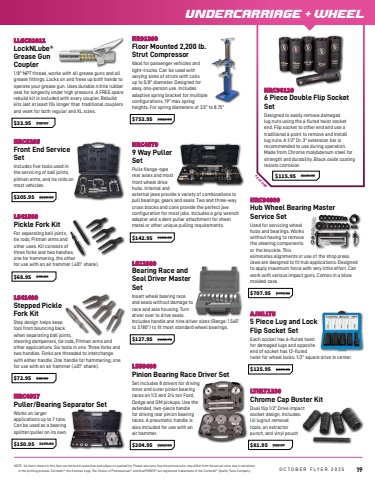 OCTOBER FLYER 2025 19 NOTE: All items shown in this flyer are limited in quantities and subject to availability. Please also note that the printed color may differ from the actual color due to variationsin the printing process. Cornwell%u00ae, the Ironman Logo, The Choice of Professionals%u00ae and bluePOWER%u00ae are registered trademarks of the Cornwell%u00ae Quality Tools Company.UNDERCARRIAGE + WHEELFEATURELLGC81011 LockNLube%u00ae Grease Gun Coupler1/8\grease fittings. Locks on and frees up both hands to operate your grease gun. Uses durable nitrile rubber seal for longevity under high pressure. A FREE spare rebuild kit is included with every coupler. Rebuild kits last at least 10x longer than traditional couplers and work for both regular and XL sizes.$33.95 $38.95 HRC6295 Front End Service SetIncludes five tools used in the servicing of ball joints, pitman arms, and tie rods on most vehicles.$205.95 $219.95 LS41500 Pickle Fork KitFor separating ball joints, tie rods, Pitman arms and other uses. Kit consists of three forks and two handles; one for hammering, the other for use with an air hammer (.401%u201d shank).$68.95 $78.05 LS41400 Stepped Pickle Fork KitStep design helps keep tool from bouncing back when separating ball joints, steering dampeners, tie rods, Pitman arms and other applications. Six tools in one. Three forks and two handles. Forks are threaded to interchange with either handle. One handle for hammering; one for use with an air hammer (.401%u201d shank).$72.95 $86.86 HR91300 Floor Mounted 2,200 lb. Strut CompressorIdeal for passenger vehicles and light-trucks. Can be used with varying sizes of struts with coils up to 5/8\easy, one-person use. Includes adaptive spring bracket for multiple configurations. 19\heights. For spring diameters of 3.5\$753.95 $932.95 HRC4579 9 Way Puller SetPulls flange-type rear axles and most front wheel drive hubs. Internal and external jaws provide a variety of combinations to pull bearings, gears and seals. Two and three-way cross blocks and cone provide the perfect jaw configuration for most jobs. Includes a grip wrench adapter and a dent puller attachment for sheet metal or other unique pulling requirements.$142.95 $168.95 HRC4517 Puller/Bearing Separator SetWorks on larger applications up to 7 tons. Can be used as a bearing splitter/puller on its own.$150.95 $179.95 LS12980 Bearing Race and Seal Driver Master SetInsert wheel bearing race and seals without damage to race and axle housing. Turn driver over to drive seals. Includes handle and nine driver sizes (Range: 1.565%u201d to 3.180%u201d) to fit most standard wheel bearings.$127.95 $140.76 LS59400 Pinion Bearing Race Driver SetSet includes 8 drivers for driving inner and outer pinion bearing races on 1/2 and 3/4 ton Ford, Dodge and GM pickups. Use the extended, two-piece handle for driving rear pinion bearing races. A pneumatic handle is also included for use with an air hammer.$204.95 $252.95 AJMLLT5 5 Piece Lug and Lock Flip Socket SetEach socket has 6-fluted twist for damaged lugs and opposite end of socket has 12-fluted twist for wheel locks. 1/2%u201d square drive in center.$125.95 $139.95 HRC96110 6 Piece Double Flip Socket SetDesigned to easily remove damaged lug nuts using the 6 fluted twist socket end. Flip socket to other end and use a traditional 6 point to remove and install lug nuts. A 1/2\recommended to use during operation. Made from Chrome molybdenum steel for strength and durability. Black oxide coating resists corrosion.$115.95 $126.95 HRC94000 Hub Wheel Bearing Master Service SetUsed for servicing wheel hubs and bearings. Works without having to remove the steering components or the knuckle. This eliminates alignments or use of the shop press. Jaws are designed to fit hub applications. Designed to apply maximum force with very little effort. Can work with various impact guns. Comes in a blow molded case.$707.95 $773.95 LTHLT1230 Chrome Cap Buster KitDual flip 1/2%u201d Drive impact socket design. Includes: (4) lugnut removal tools, an extractor punch, and vinyl pouch$81.95 $90.97