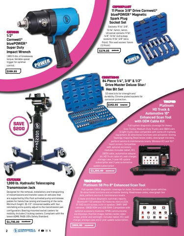 CAT5380 1/2\Cornwell%u00ae bluePOWER%u00ae Super Duty Impact Wrench1,800 ft-lbs. of breakaway torque. Variable speed trigger for optimal control.$399.95 CBSMTH84S 84 Piece 1/4%u201d, 3/8%u201d & 1/2%u201d Drive Master Deluxe Star/Hex Bit SetS2 steel bits for strength and durability. Chrome plated sockets for corrosion protection.$343.95 $432.95 CTJTJ1KH 1,000 lb. Hydraulic Telescoping Transmission JackDesigned for the removal, installation, and transporting of transmissions and transfer cases on vehicles that are supported by lifts. Foot activated pump and release pedals for hands free raising and lowering of the rams. Minimum height: 35-1/2%u201d. Universal saddle with four ratcheting arms quickly adjust to the transmission pan configuration. Bearing mounted swivel casters for mobility. Includes 2 locking casters. Compliant with the latest ASME PASE-2014 Safety Standard.$1,795.00 $1,995.00 2THCPHD Platinum HD Truck & Automotive 10\Enhanced Scan Tool with OEM Cable KitFull system diagnostic coverage for HeavyDuty Trucks, Medium-Duty Trucks, and OBDII cars & light trucks. Also compatible with some off-highway equipment. Bi-directional functions and activation testing. Topology mapping, Read/erase codes, view/graph live data, perform service & maintenance resets. Wireless VCI and 10.1\touch screen. Compatible with optional accessory modules. Includes tablet, VCI, OBDII cable, automotive adapter kit, HD Truck cable kit, wall charger, storage case, 2-year HD update subscription and 2-year automotive update subscription$2,395.00 $2,595.00 THCPS8PRO Platinum S8 Pro 8\Full system OBDII diagnostic coverage for Asian, Domestic and European vehicles. Bi-directional functions and activation testing. Read/erase codes, view/graph live data, perform service & maintenance resets. Create and share diagnostic summary reports. Bluetooth%u00ae 5.0 wireless VCI features status LEDs. 8\cameras. 128GB ROM and 4GB RAM. Compatible with optional accessory modules: TPMS communicator, oscilloscope, thermal imager, battery tester, video scope, printer and worklight. Includes tablet, VCI, wall charger, storage case and 2-year update subscription.$999.00 $1,249.00 CBPMSP11ST 11 Piece 3/8\bluePOWER%u00ae Magnetic Spark Plug Socket SetSockets: 9/16\13/16\Universal sockets: 9/16\5/8\sockets: 9/16\Point). Thin wall socket: 14mm (12 Point)$174.95 $241.95 SAVE$200