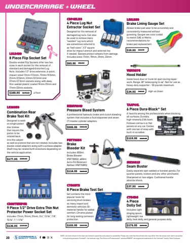20 NOTE: All items shown in this flyer are limited in quantities and subject to availability. Please also note that the printed color may differ from the actual color due to variationsin the printing process. Cornwell%u00ae, the Ironman Logo, The Choice of Professionals%u00ae and bluePOWER%u00ae are registered trademarks of the Cornwell%u00ae Quality Tools Company.UNDERCARRIAGE + WHEELCBP4ELNS 4 Piece Lug Nut Extractor Socket SetDesigned for the removal of damaged lug nuts. Can also be used to remove many %u201cswollen%u201d lug nuts which are sometimes referred to as %u201chalf sizes%u201d. 1/2%u201d square drive for impact wrench and external hex if needed. Sleeves protect wheels from damage. Includes sizes: 17mm, 19mm, 21mm, 22mm$85.95 $96.95 CBS9TWNPSR 9 Piece 1/2%u201d Drive Extra Thin Nut Protector Power Socket SetIncludes: 17mm, 19mm, 21mm, 3/4%u201d, 13/16%u201d, 7/8%u201d, 15/16%u201d, 1%u201d, 1-1/16%u201d$136.95 $157.95 FEATURENEMV6840 Pressure Bleed SystemA professional hydraulic brake and clutch bleeding system that includes a fluid dispenser and seven (7) master cylinder adapters.$585.95 $656.95 PBT70854 Brake Bleeder KitIncludes: 800ml Brake Bleeder (PBT70852), 600ml Auto-Fill Reservoir Refiller (PBT70895)$114.95 $128.63 LS29350 Combination Rear Brake Tool KitDesigned to work on single piston disc brakes that require the piston to be rotated back into the caliper as well as pistons that are not rotated. Includes two double-sided adapters along with a pinless adapter. Shaft may be rotated both directions depending on the vehicle application.$177.95 $205.66 CTG8BTS 8 Piece Brake Tool SetSet contains the most popular tools for servicing drum brakes on many import and domestic vehicles. Bimaterial handle for added comfort. Chrome plated for long lasting corrosion protection.$103.95 $111.95 LS81850 Brake Lining Gauge SetAllows brake pad wear to be accurately and consistently measured without guessing. Gauges are color coded to match SAE or Metric recommendations for brake pad replacement.$19.95 $24.70 VMV387G Hood HolderHolds hood, door or trunk lid open during repair work. Range: 28%u201d telescoping to 46%u201d. Not for use as heavy-duty supporter - 50 pounds maximum.$34.95 $42.21 High-vis Green TAAF44L 6 Piece Dura-Block%u00ae SetA favorite among the professionals when blocking all surfaces. Durable, high-intensity EVA foam. Follows contours or flat panels on any car. Comes with one bar of soap with built-in scrubber.$119.95 $120.00 SM20015 Seam BusterEasily separate spot welded or bonded panels. For quarter panels, rockers and any other pinchweld. Sharpened on two edges. Cushioned handle absorbs shock.$37.95 $39.95 CTG4DS 4 Piece Dolly SetIncludes: light dinging spoon, lightweight toe dolly, heel dolly, and general purpose dolly$179.95 $234.95 LS13430 8 Piece Flip Socket SetDouble-ended Flip Sockets offer two hex sizes in each socket for the removal of standard and damaged/distorted Lug Nuts. Includes 1/2\impact rated 17mm/17.5mm, 19mm/19.5mm, 21mm/21.5mm, 22mm/22.5mm and 27mm/27.5mm sockets along with deep, thin-walled plastic coated 19mm/21mm and 17mm/22mm sockets.$160.95 $179.25 6 Point NEW!