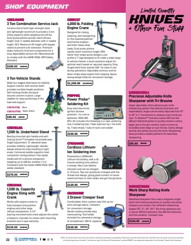 22 NOTE: All items shown in this flyer are limited in quantities and subject to availability. Please also note that the printed color may differ from the actual color due to variationsin the printing process. Cornwell%u00ae, the Ironman Logo, The Choice of Professionals%u00ae and bluePOWER%u00ae are registered trademarks of the Cornwell%u00ae Quality Tools Company.SHOP EQUIPMENTKNIVESDSWSKTNRKS Work Sharp Rolling Knife SharpenerHandheld sharpener that uses a magnetic angle block and rotating abrasives to quickly and easily sharpen your knives. Four different sharpening angles (15%u00b0, 17%u00b0, 20%u00b0, 25%u00b0). The three abrasives are a coarse 320 Grit diamond, fine 600 Grit diamond, and fine ceramic. Compact size.$136.95 $149.95 CSESJ30HN 3 Ton Combination Service JackConstructed of both high-strength steel and lightweight aluminum to provide a 3 ton lifting capacity while weighing only 65 lbs. Dual-pump pistons quickly reach service height. Over 4\height. 18.5\valves to prevent over extension. Premium seals, hydraulic fluid and components for a long, dependable service life. Manufactured to comply with the ASME PASE-2019 Safety Standard.$399.95 $480.95 3 Ton Vehicle StandsWide four legged steel base for stability. Support column with ratchet teeth provides multiple height positions. Self-locking handle and pawl secures column in place. Large saddles for easy positioning of the load and support.CSEVS3TBL Blue$69.95 $89.95 CSEVS3TNG Neon GreenCSEUH15A 1,500 lb. Underhoist StandBearing mounted spin handle and selflocking Acme%u2122 threaded rod provide easy height adjustment. 12%u201d diameter base provides stability. Lightweight, slender design allows for easy handling in tight areas. Contoured saddle supports most component configurations. Foot pedal model will lift a vehicle component weighing up to 400 lbs. another 1-1/4%u201d. Compliant with the latest ASME PASE-2014 safety standard.$279.95 $309.95 CSEEC2T 4,000 lb. Folding Engine CraneDesigned for raising, lowering, and transporting (in the lowered position) automotive engines and other heavy shop loads. Dual pump pistons rapidly reach maximum height 25% faster than single pump designs. Low profile 4.7%u201d legs designed to fit under a wide range of vehicle frames. 4 boom positions adjust for optimal reach based on required capacity. Drop forged steel hook swivels 360%u00b0 for ease of use during operations. Adjustable anchors, and tie down straps keep engine from swaying. Space saving design folds for convenient storage.$1,299.00 $1,499.00 CSE1500A 1,500 lb. Capacity Engine Sling with CrankWorks with engine cranes to help transport and position engines and other large vehicle components. 3-1/4\bearing-mounted hand crank adjusts the center of balance. Includes (4) chains with mounting brackets and 2-year warranty.$119.95 $139.95 PWPPSK Power Probe%u00ae Soldering KitEasy start electronic ignition. Butane powered - no cord or batteries. 120W, 500 BTU. Kit includes the following in a case: soldering tool, 3 soldering tips, 1 heat injection tip, 1 hot knife tip, 1 heat shield, 1 tube of rosin core solder$109.95 $124.95 CTG3200SK Cordless LithiumIon Soldering IronPowered by a 3200mAH Lithium-Ion battery, with a 45 minute working time without a charge. Has a low battery indicator and can be charged in 1.5 hours. Tips can quickly be changed with the thread lock design, giving good contact to insure maximum heat to melt solder and get the job done.$139.95 $159.95 CRCS2DRW 2 Drawer Creeper SeatComfortable, thick cushion seat lifts up for extra storage space. 2 drawers for convenient storage. Swivel casters provide easy maneuvering. Tool holder included for convenient storage of screwdrivers. 300 lb. capacity.$229.95 $269.95 DSWSBCHPAJ Precision Adjustable Knife Sharpener with Tri-BrasiveAngle adjustable, three abrasive grit, knife sharpening system that delivers precision and repeatability. Angle can be easily adjusted from 15%u00b0 to 30%u00b0 in 1%u00b0 increments to sharpen every knife you own. Tri-Brasive%u2122 includes coarse 320 and fine 600 grit diamond plates to quickly restore a sharp edge, and a fine grit ceramic stone to hone an incredibly keen edge on your knives. Clamp design quickly and safely secures the knife. Sharpening base provides a stable platform for benchtop sharpening.$59.95 $81.95 + Other Fun StuffLimited Quantity